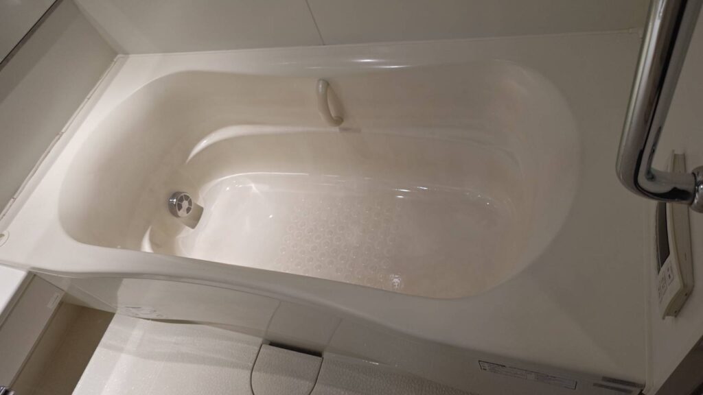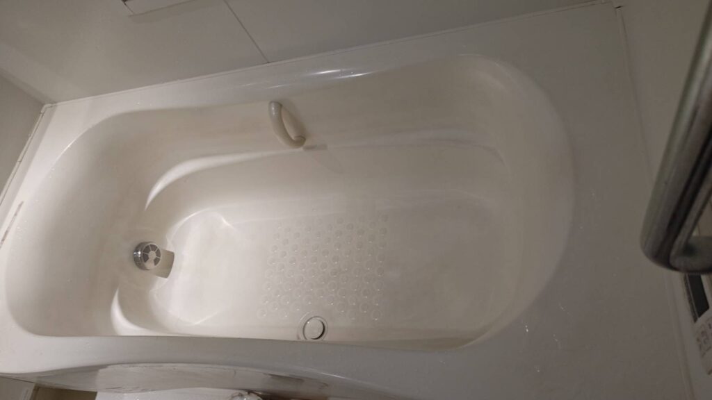 浴室では、椅子の脚まわりや湯船側面の壁に水垢が付着。
