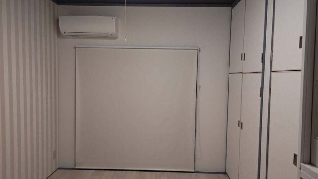 書庫を設置するため、クローゼット内部を一部解体する工夫も実施。さらに、既存のレールカーテンを撤去し、プロジェクター対応のロールカーテンへ変更しています♪
